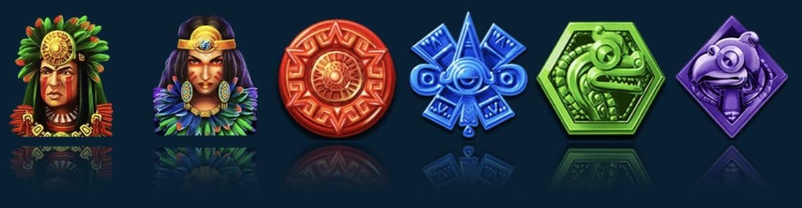 De lavere betalende symboler består af de klassiske kort værdier, og de højere betalende symboler er tematisk passende og inkluderer forskellige aztekiske figurer og artefakter. Du får gevinster på mellem 3-6 af samme symbol på en gevinst linje.